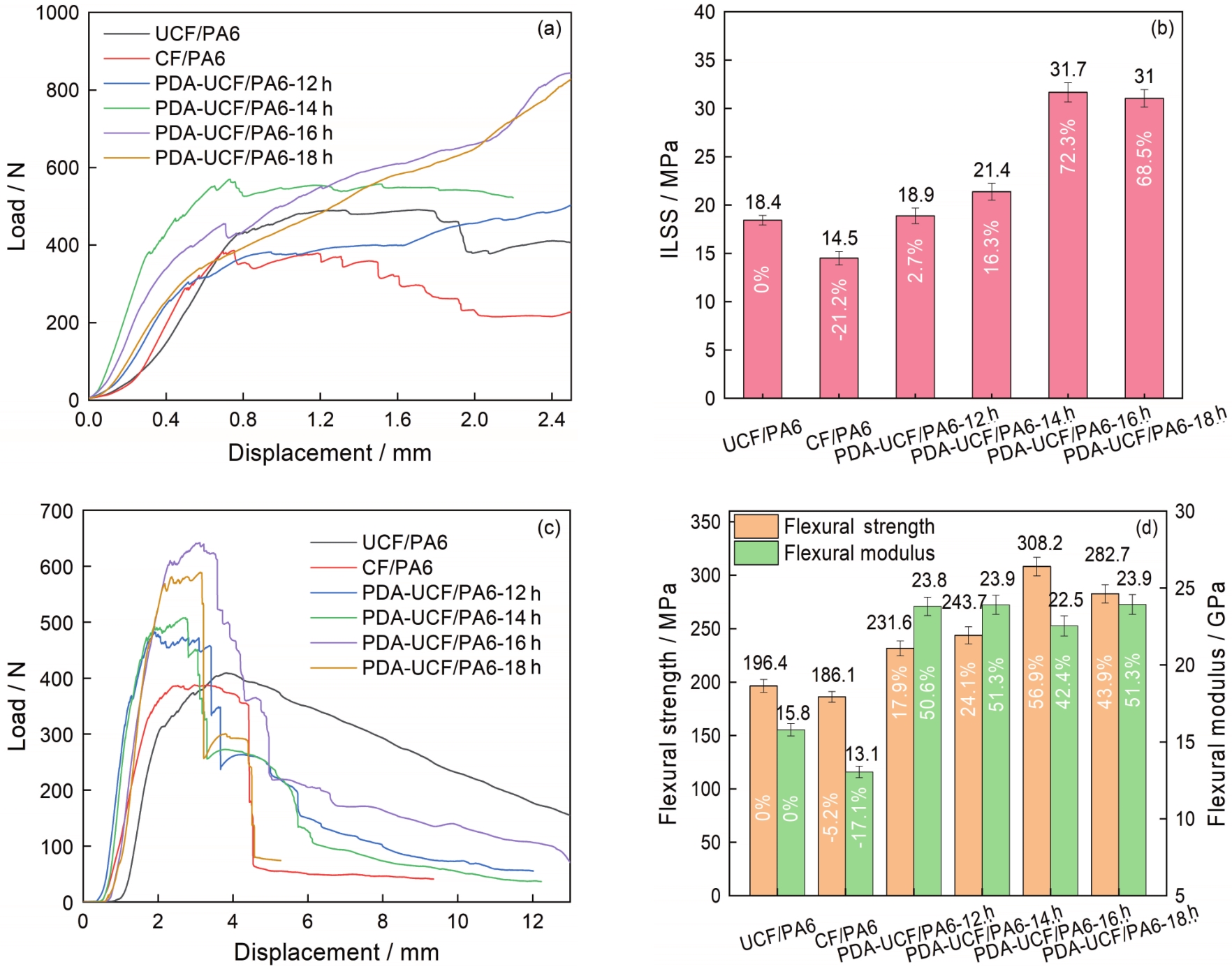 | Fig.3 Typical load-displacement curves in the interlaminar shear testing (a), interlaminar shear strength (ILSS) of composites (b), typical load-displacement curvers in the flexural testing (c), flexural strength and modulus (d) of composites |