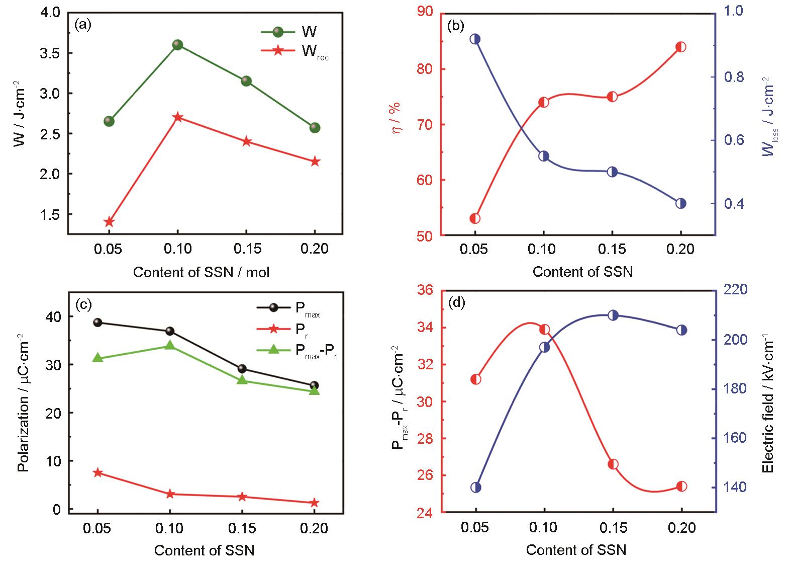 | Fig 6 (a) Relationship between W and Wrec;(b) η and Wloss; (c) Pmax, Pr and Pmax-Pr; (d) the curves of Pmax-PrvsE for (1-x)(BNTA) -xSSN ceramics |