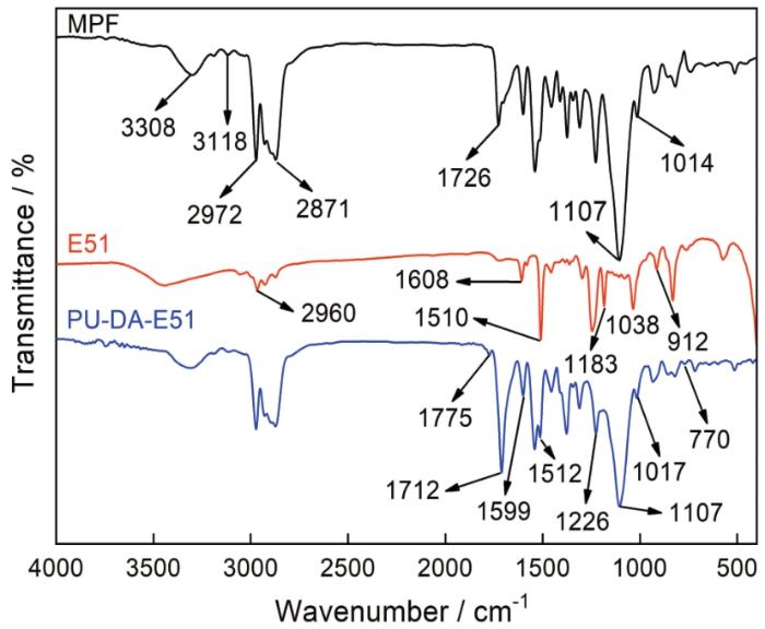图1给出了聚氨酯预聚体(MPF)、E51环氧树脂和环氧树脂改性热可逆聚氨酯PU-DA-E51的红外光谱。在MPF红外光谱中,在1014 cm-1出现的是呋喃环的呼吸振动峰;1107 cm-1处的为C—O键的伸缩振动峰;1726 cm-1处的为氨基甲酸酯中C=O键的伸缩振动峰;2972 cm-1和2871 cm-1处的为—CH2—的不对称和对称伸缩振动峰;3118 cm-1处的为呋喃环上C—H键的伸缩振动峰;3308 cm-1处的为氨基甲酸酯中N—H键的伸缩振动峰。在2270 cm-1附近并没有出现—NCO的特征吸收峰,表明—NCO与糠胺反应完全[17]。以上结构特征表明成功合成了呋喃封端的聚氨酯预聚体(MPF)。