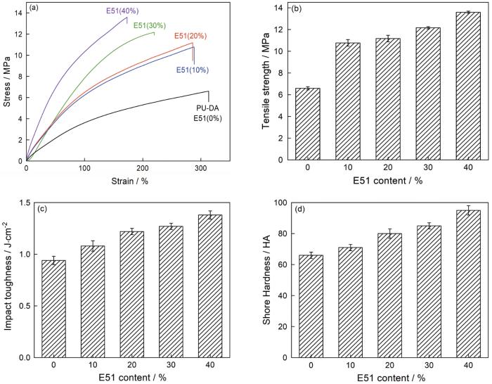 Representative stress-strain curves (a) and effects of content of E51 on tensile strength (b), impact toughness (c), and Shore hardness (d) of PU-DA-E51
