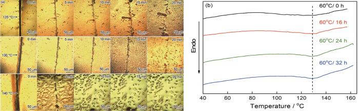 POM images of crack evolution upon treated with different temperatures (a) and DSC curves of PU-DA-E51 after treated for various time at 60℃ (b)