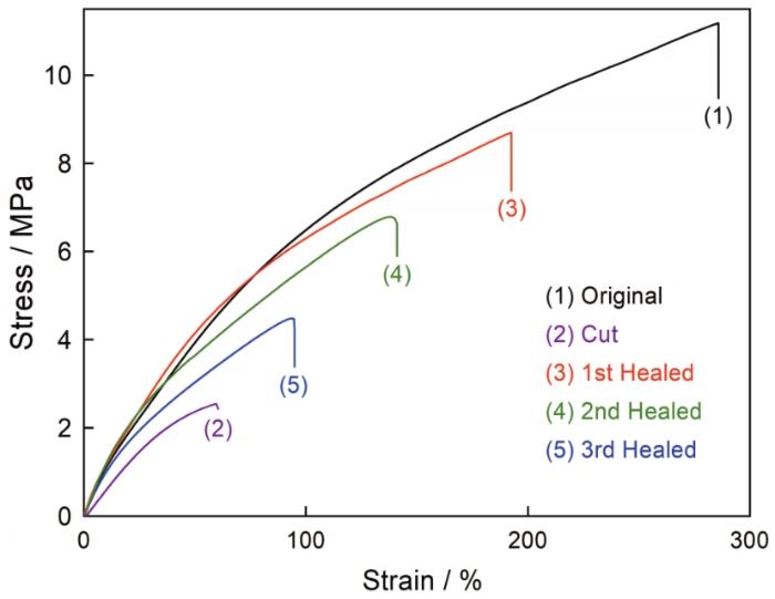 Representative stress-strain curves of PU-DA-E51 after different damage-healing cycles