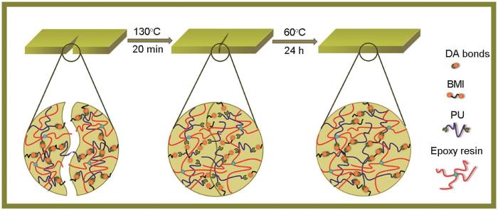 Schematic strengthening principle for mechanical properties and self-healing mechanism of PU-DA-E51
