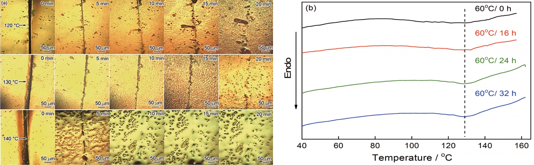 Fig.3 POM images of crack evolution upon treated with different temperatures (a) and DSC curves of PU-DA-E51 after treated for various time at 60℃ (b) |