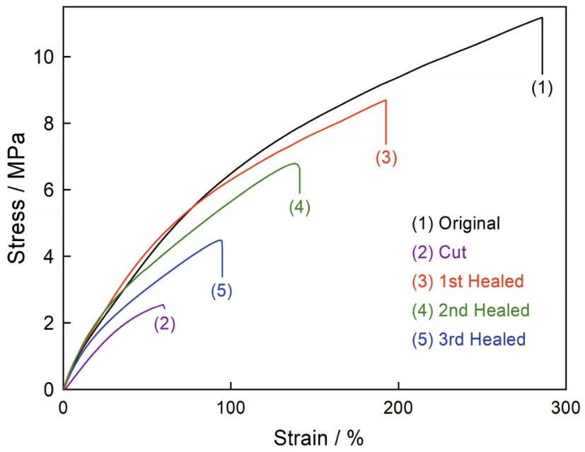 Fig.4 Representative stress-strain curves of PU-DA-E51 after different damage-healing cycles |