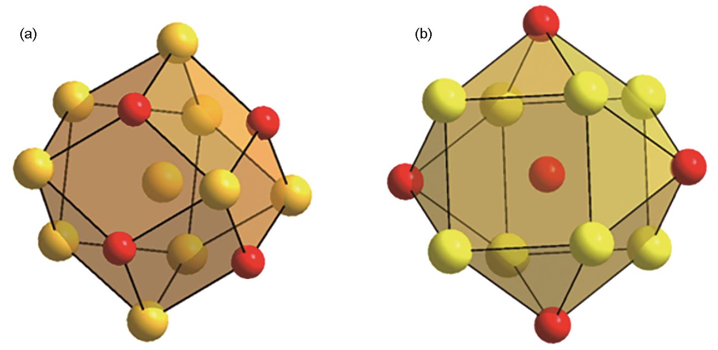 | Fig.1 Two kinds of clusters in CuZr2 phase (a) [Cu-Zr8Cu4] with Cu atom as the center and (b) [Zr-Cu4Zr9] with Zr atom as the center, with the yellow spheres representing Zr atoms and the red ones representing Cu atoms |