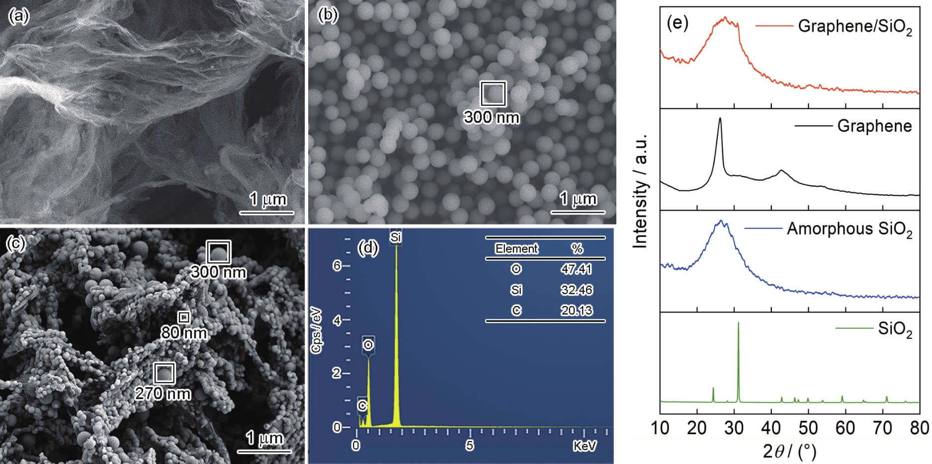 | Fig.2 SEM images of different samples (a) graphene, (b) SiO2, (c) graphene/SiO2; (d) energy spectrum of Graphene/SiO2;(e) XRD patterns of Graphene/SiO2, Graphene, Amorphous SiO2 and SiO2 |