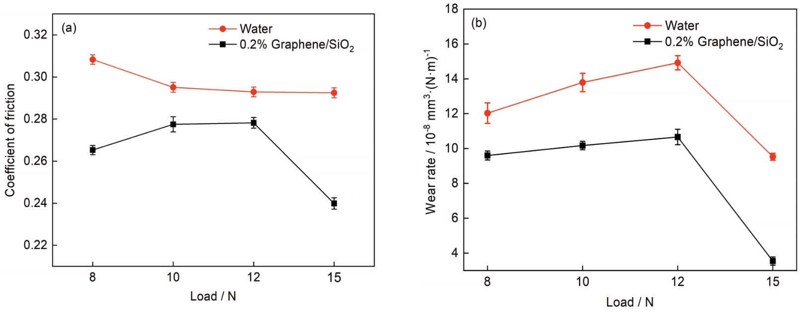 | Fig.7 Coefficient of Friction(a) and wear rates of water and Graphene/SiO2 (b) under various load conditions |