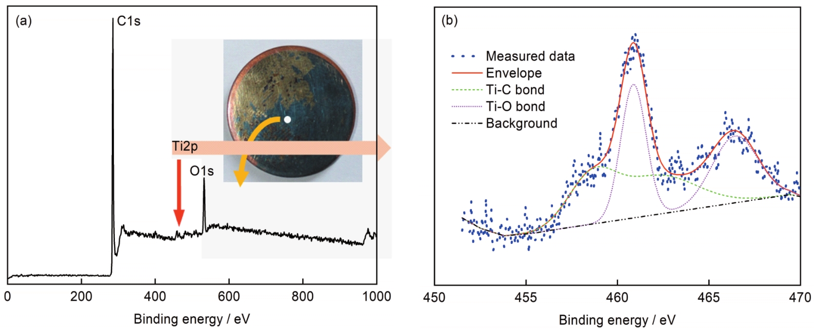 Fig.3 XPS survey (a) and Ti2p peak (b) of the exposed surface of carbon-based complex coating with structure II |