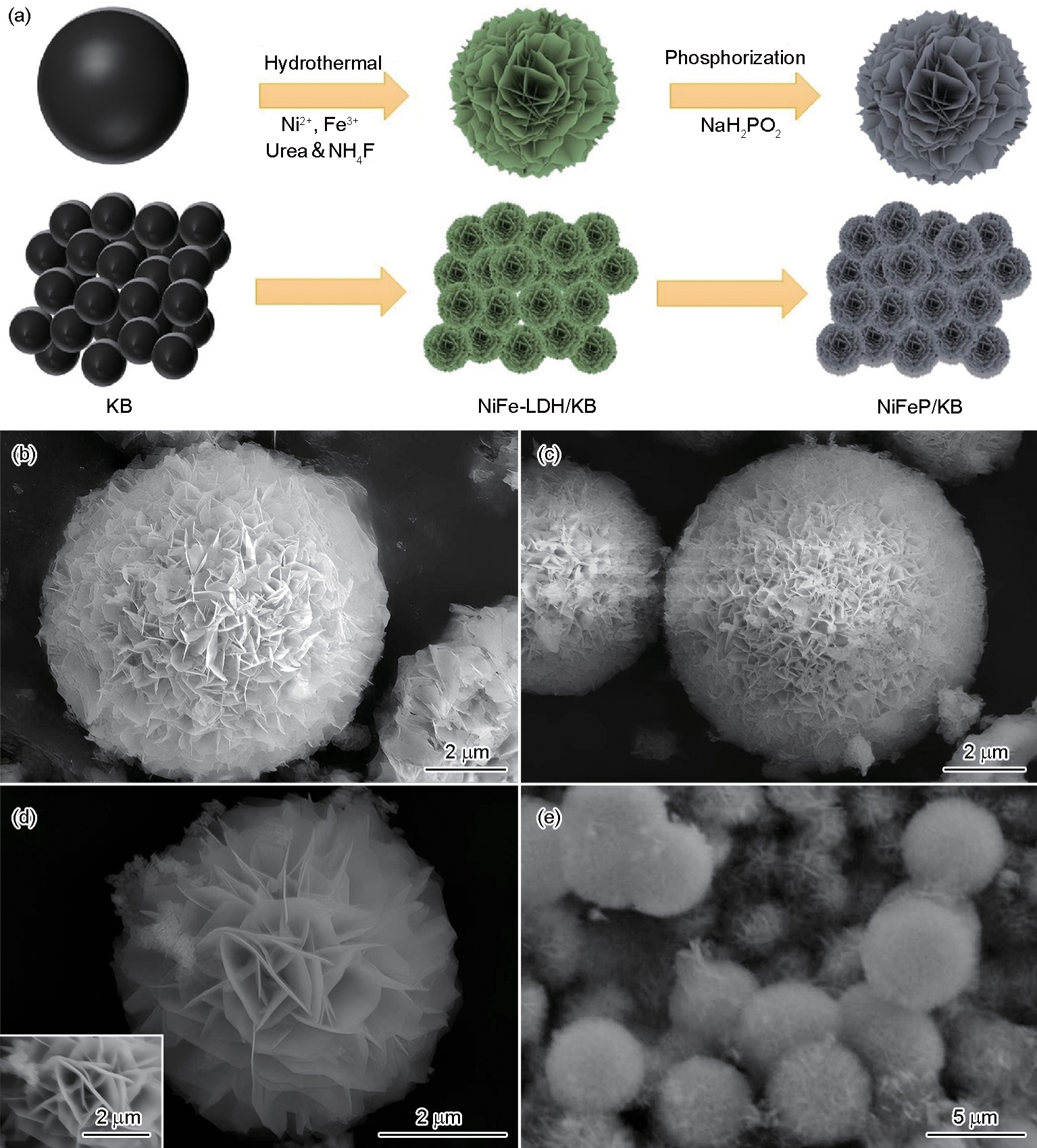 | Fig.1 Synthesis schematic of NiFeP/K B (a), SEM of NiFe-LDH (b, d), SEM of NiFeP (c) and SEM of NiFeP/KB (e) |