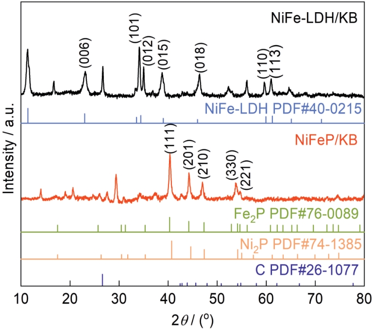 | Fig.3 XRD patterns of NiFe-LDH/KB and NiFeP/KB |