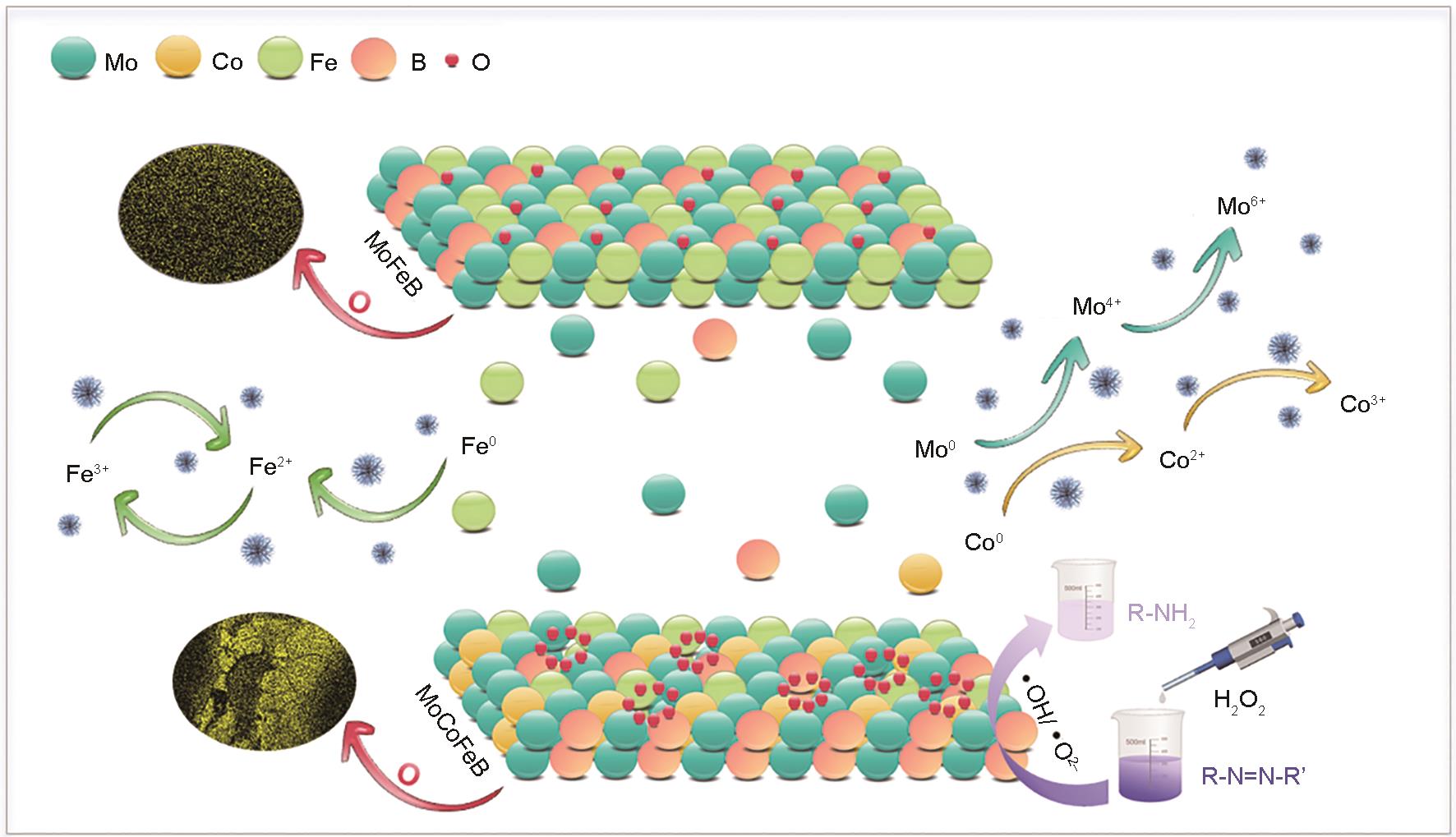 | 图12 Mo51Co17Fe17B15和Mo51Fe34B15非晶合金丝材降解结晶紫染料废水的机理示意图 |