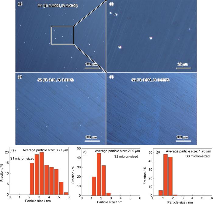 Metallographic observation and size analysis of second phase particle distribution (a, b, e) S1, (c, f) S2, (d, g) S3