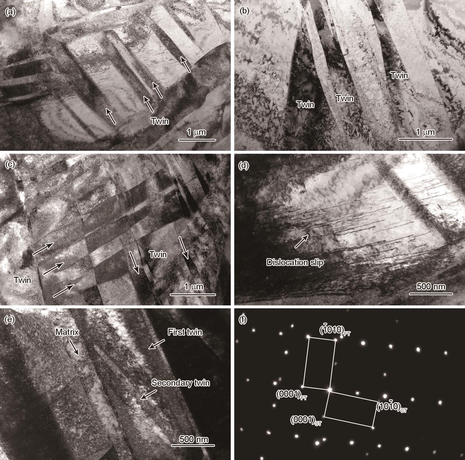 Fig.8 TEM micrographs of tensile specimen of as annealed Ti-Al-Fe alloy deformed at -196oC (a) parallel twin; (b) intersected twin; (c) braided twin; (d) dislocation slipping in the twin; (e) secondary twin; (f) TEM diffraction pattern calibration of the first twin and secondary twin |
