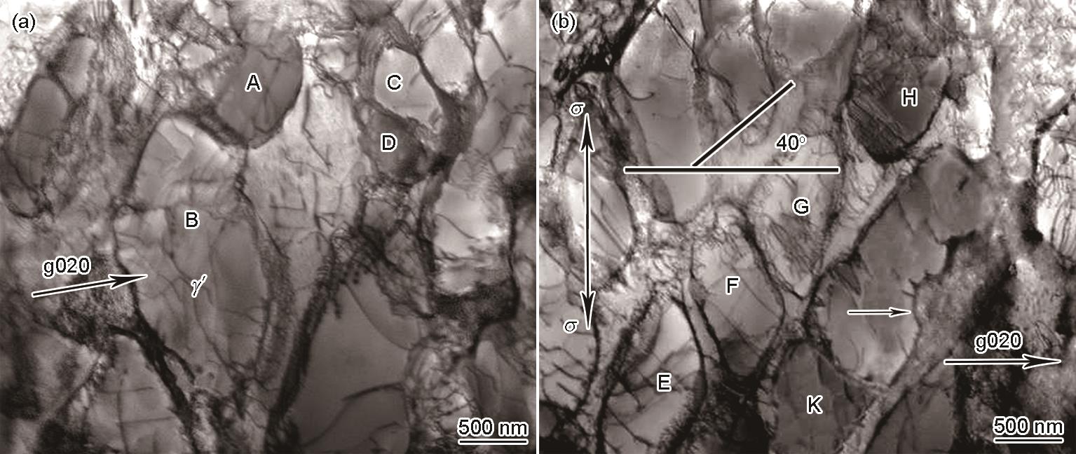 图10 合金在1100℃/140 MPa条件下蠕变476 h断裂后的组织结构 |