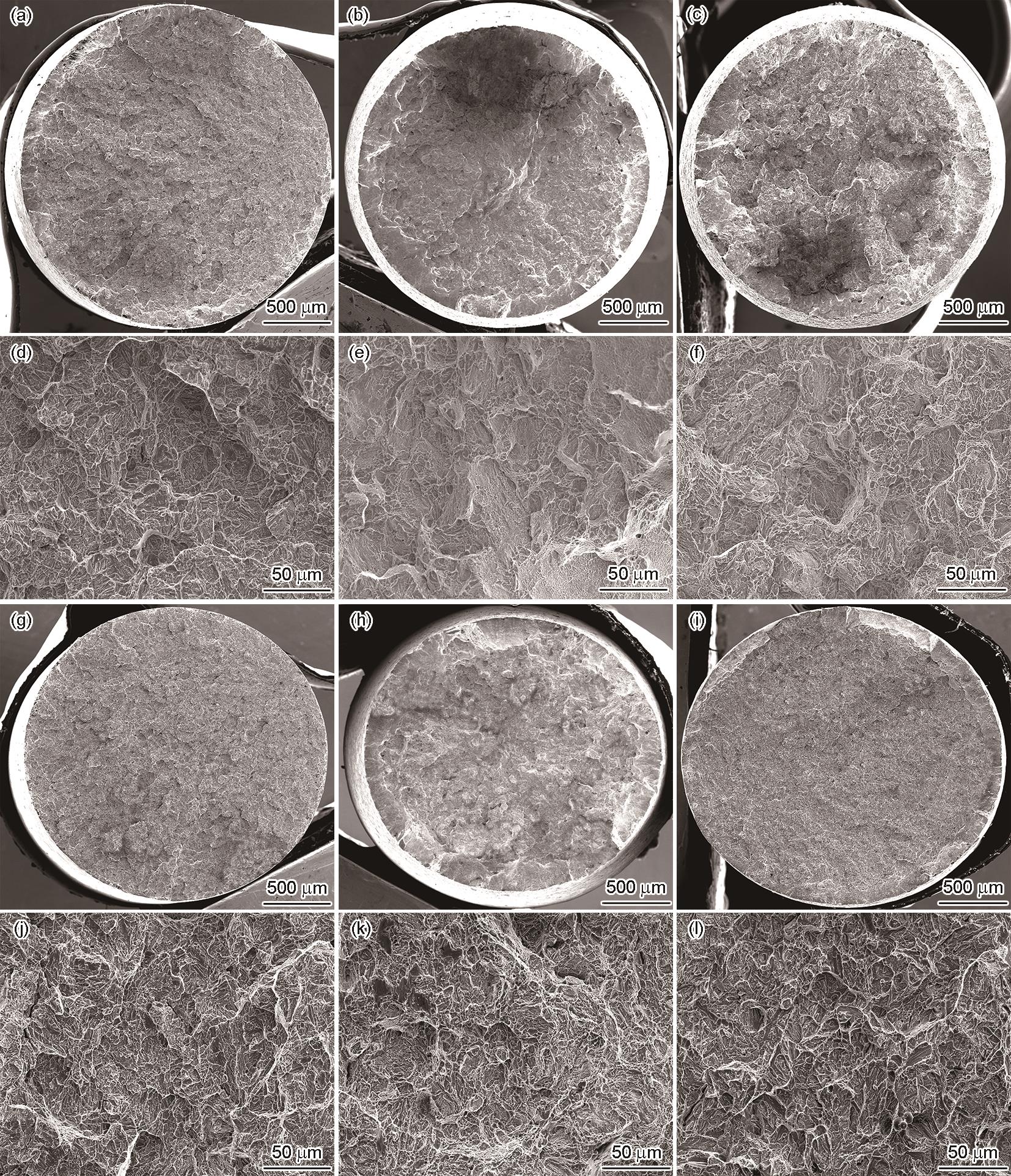 | 图10 不同等温淬火工艺实验钢的拉伸断口SEM照片 |