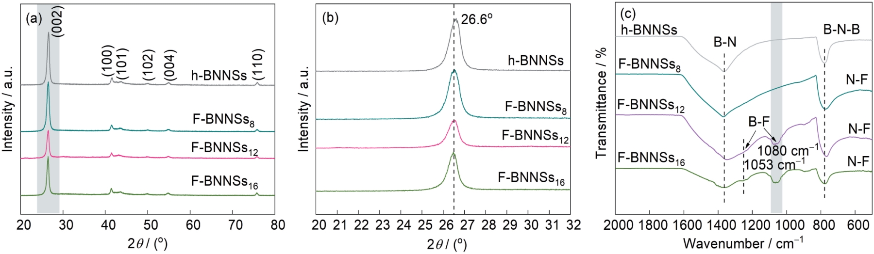 | Fig.2 XRD of F-BNNSs and local magnification (a, b) and FTIR of F-BNNSs (c) |