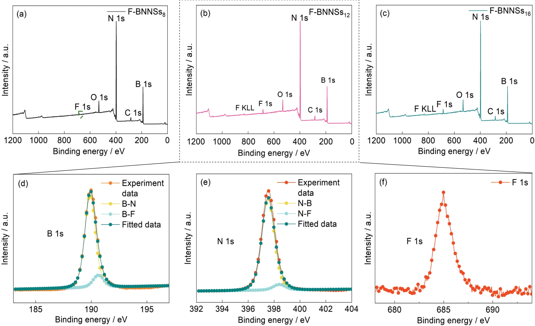| Fig.3 XPS of F-BNNS and XPS narrow spectra of F-BNNSs12 (a~c) XPS full spectra of F-BNNSs8, F-BNNSs12, and F-BNNSs16; (d~f) B 1s, N 1s, F 1s |