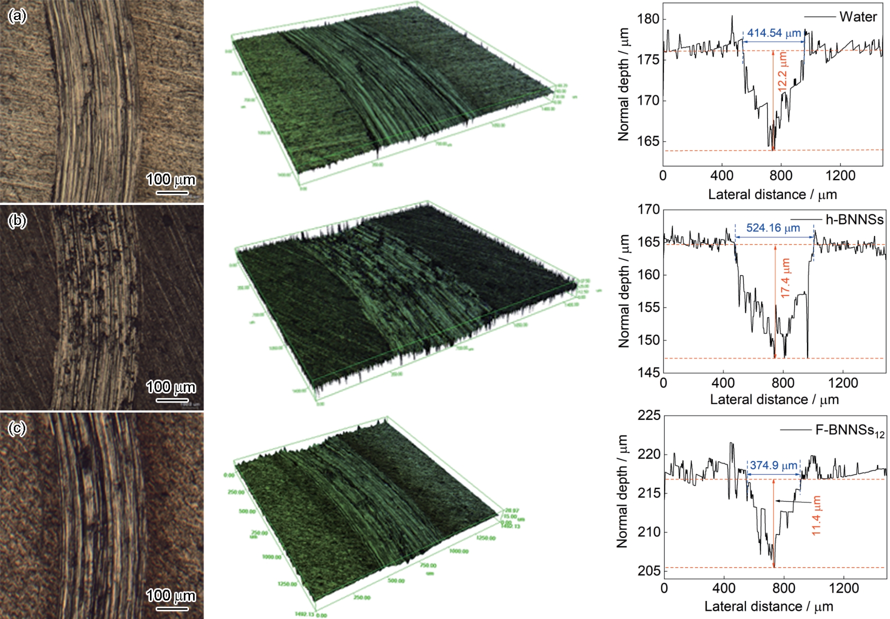 | Fig.11 Wear scar, 3D contour map and 2D height profile of TC4 disk wear surface (a) pure water; (b) h-BNNSs; (c) F-BNNSs12 |