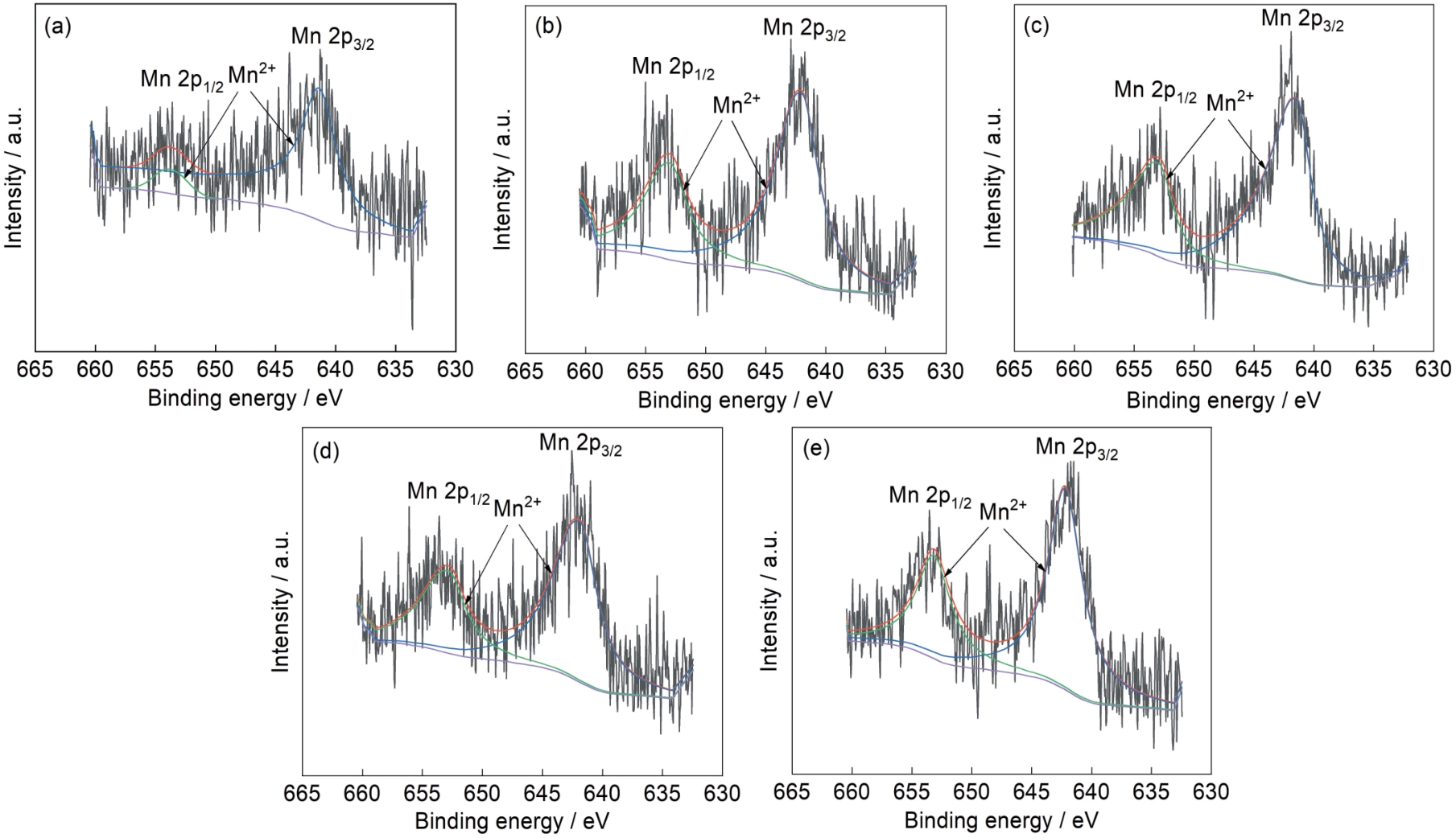 | Fig.4 Mn2p XPS fine spectra of (Y0.4Er0.6)3(Al1 - yMny)5O12 ceramic materials with different doping contents (a) y = 0.02; (b) y = 0.04; (c) y = 0.06; (d) y = 0.08; (e) y = 0.1 |