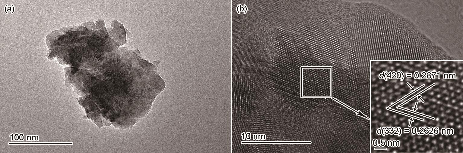 | Fig.5 TEM and HRTEM images of (Y0.4Er0.6)3(Al0.94Mn0.06)5O12 ceramic material |