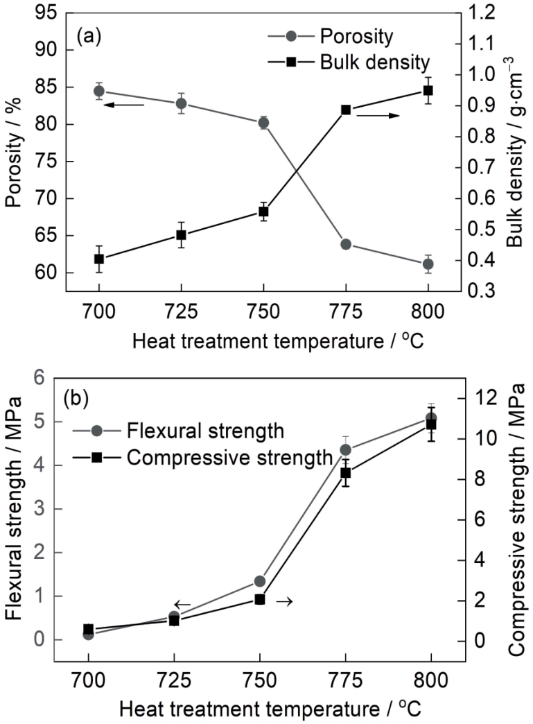 | Fig.7 Porosity, bulk density, flexural and compressive strength of porous ceramics prepared at different heat treatment temperatures (a) porosity and bulk density, (b) flexural strength and compressive strength |