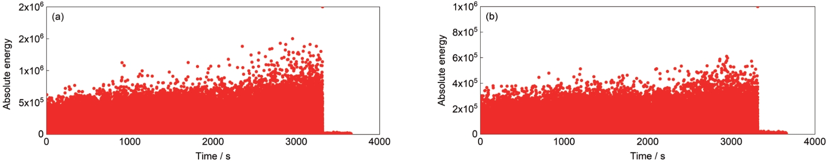 | Fig.9 Magnification of acoustic emission parameter absolute energy in channel 1 (a) and channel 3 (b) |