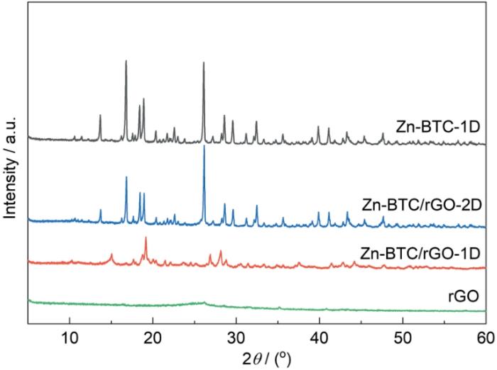 rGO、Zn-BTC-1D、Zn-BTC/rGO-1D和Zn-BTC/rGO-2D样品的XRD谱