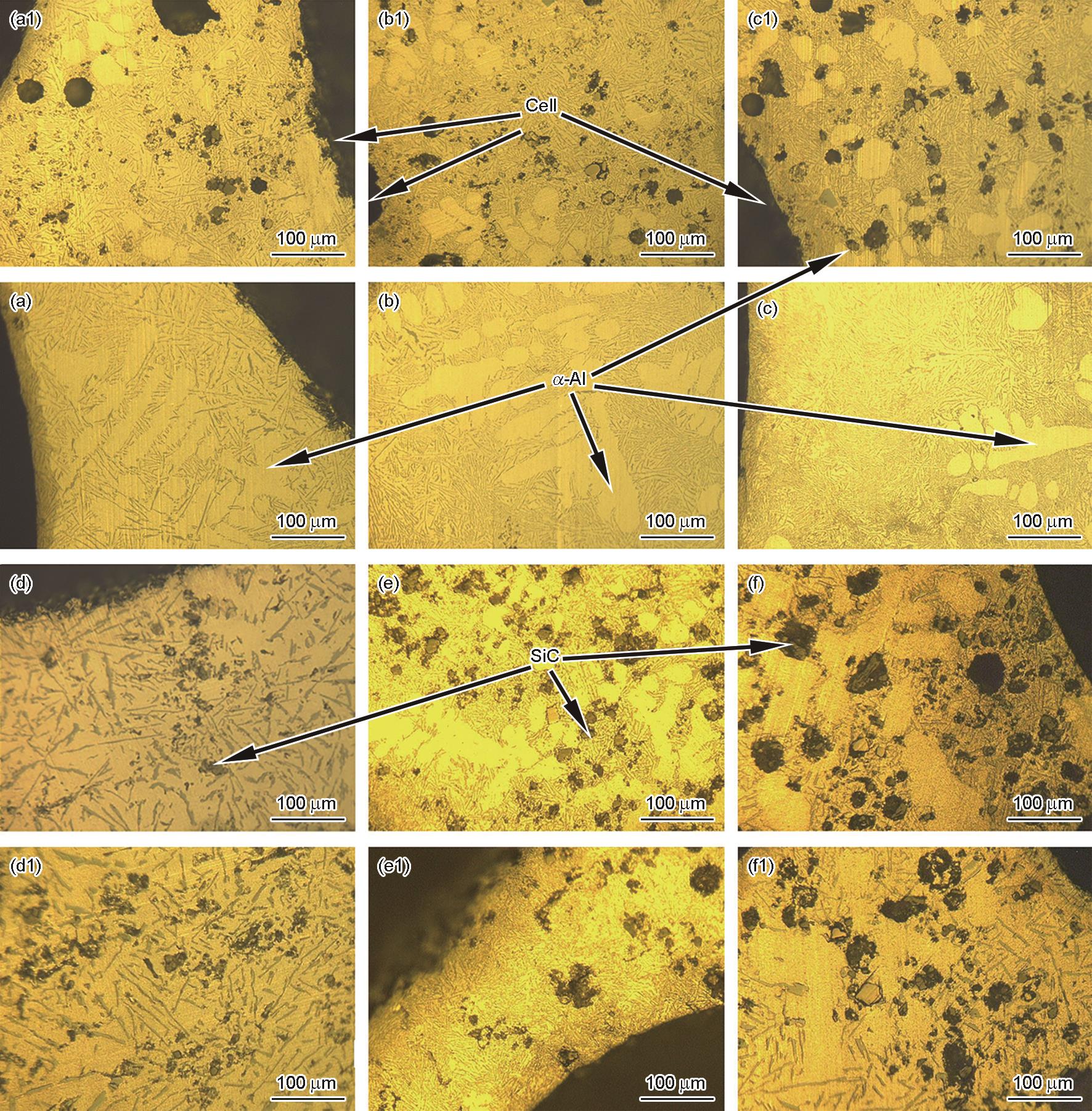 Fig.7 Microstructure of 1%~8%SiC aluminum foams prepared at 680oC (a, a1) 1%SiC; (b, b1) 2%SiC; (c, c1) 3%SiC; (d, d1)4%SiC; (e, e1) 6%SiC; (f, f1) 8%SiC |