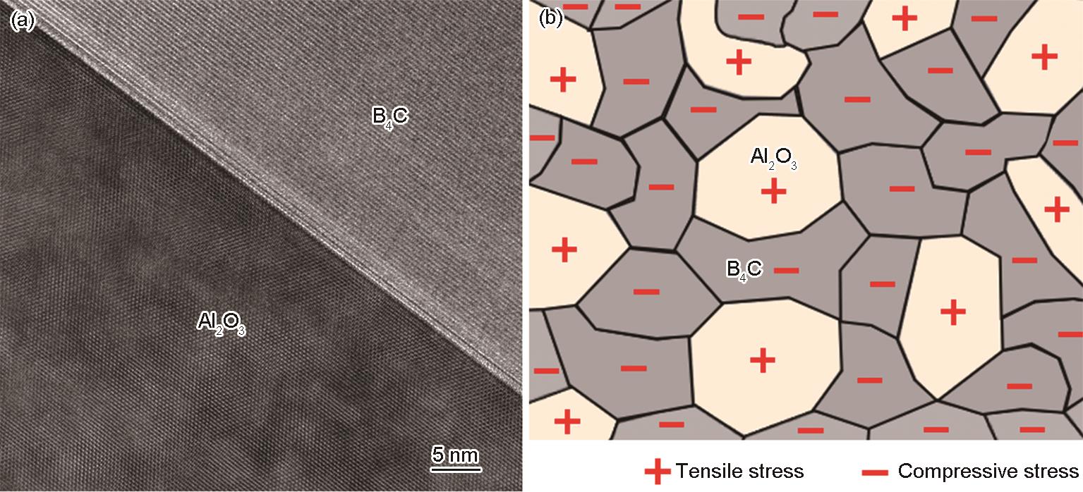 | Fig.7 HRTEM image of A4 specimen (a) and schematic diagram of stress distribution in B4C-Al2O3 composite ceramics (b) |