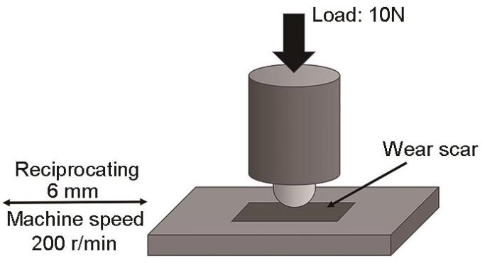 使用维氏硬度计测试不同稀土含量的铸态Al-Zn合金的室温硬度,试验力为9.8 N,加载保持时间为10 s,使测量硬度的平面与压头压下方向成直角,每个试样测试5个点,取其结果的平均值。用HSR-2M型高速往复摩擦试验机测试铸态Al-Zn合金的耐磨性,载荷力为10 N,转速为200 r/min,磨损痕的长度为6 mm,摩擦实验的方式在图1中给出。在铸态合金的1/2处切取尺寸为10 mm × 10 mm × 10 mm的试样(以保证均匀性)用于微观组织分析。用400#、800#、1500#、3000#、5000#砂纸将试样打磨、用金刚石研磨膏进行粗抛光、用二氧化硅精抛液进行精抛光、用无水乙醇超声波清洗以及阳极覆膜制备金相、偏光、SEM和XRD样品,并用截线法测量晶粒的大小。用OLYMPUS BX53型光学金相显微镜(OM)和扫描电子显微镜(SEM)观察显微组织并进行能谱分析(EDS)检测样品内部相的成分。用X射线衍射仪(XRD)分析合金的物相组成。