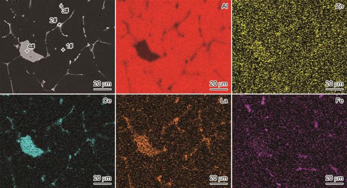 图4给出了0.75%RE铸态Al-Zn合金的SEM图像,对合金进行EDS点扫和面扫分析,表2列出了图4中标示点的EDS分析结果。图4中灰黑色的相为基体相,主要成分为Al:97.8%和Zn:1.9%,还有少量的Fe、Ce和La。位于晶界处的亮白色相主要成分为Al:75.63%、Zn:4.54%、Ce:12.00%、La:7.67%。EDS面扫分析结果表明,稀土元素Ce和La在晶界处偏聚,Fe在晶界富集[22]。合金的α-Al基体中均匀分布着大量点状相,并且随着混合稀土含量的提高其数量随之增多。点状相的主要成分为Al:73.40%、Zn:4.30%、Ce:10.38%、La:5.21%、Fe:5.91%,是合金中的杂质铁生成的富铁相,也引起混合稀土元素的偏聚。根据XRD谱和文献[23~25],点状相主要是依附于铁生长的点状共晶Al11Ce3和Al11La3相。在混合稀土含量为0.75%的合金中生成了尺寸约为20 μm的深灰色棒状相,其主要成分是Al:86.25%、Zn:4.50%、Ce:9.11%以及少量La。这种点状相是富铈相,由文献[26]可知可能是棒状初生Al11Ce3相。