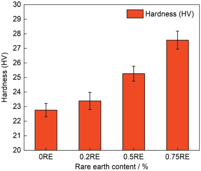 不同混合稀土含量的Al-Zn合金的硬度,如图7所示。可以看出,随着稀土含量的提高合金的硬度随之提高。未加稀土元素的Al-Zn合金,其硬度约为22.7HV。稀土元素含量为0.2%、0.5%和0.75%的铸态合金,其硬度分别为23.4HV、25.3HV和27.5HV。