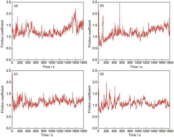 Friction coefficient curves of Al-Zn alloys with different rare earth contents (a) 0%, (b) 0.2%, (c) 0.5%, (d) 0.75%