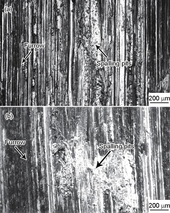 Wear surface morphology of Al-Zn alloys with different rare earth contents (a) 0%, (b) 0.75%