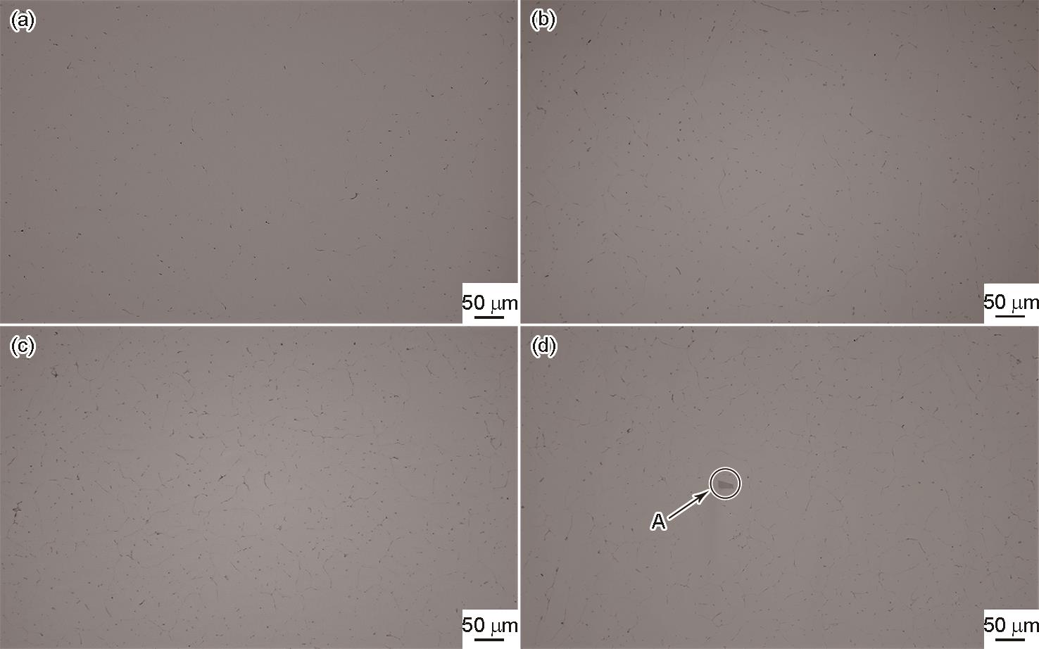 Fig.2 Metallographic structure of Al-Zn alloys with different rare earth contents (a) 0%RE, (b) 0.2%RE, (c) 0.5%RE, (d)0.75%RE |