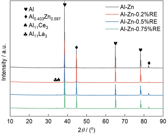 图3 不同稀土含量Al-Zn合金的XRD谱 |