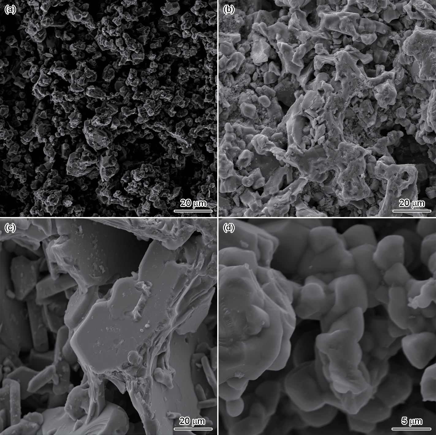 | Fig.2 SEM characterization of SiC samples (a) SEM image of the T1800 specimen, (b) SEM image of the T2000 specimen, (c) SEM image of the T2200 specimen, (d) typical surface morphology of SiC grain growth at 2000oC |