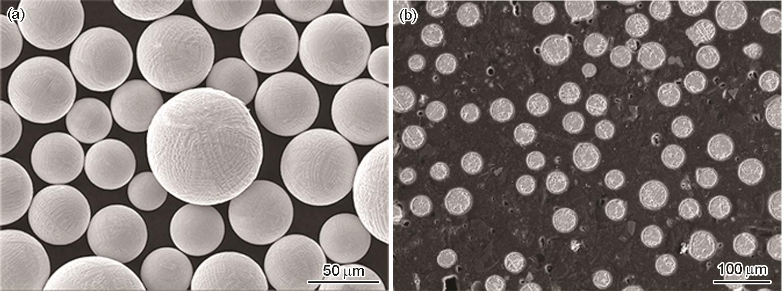 | Fig.2 Morphology of GH4099 pre-alloyed powder (a) powder surface, (b) powder cross-section |