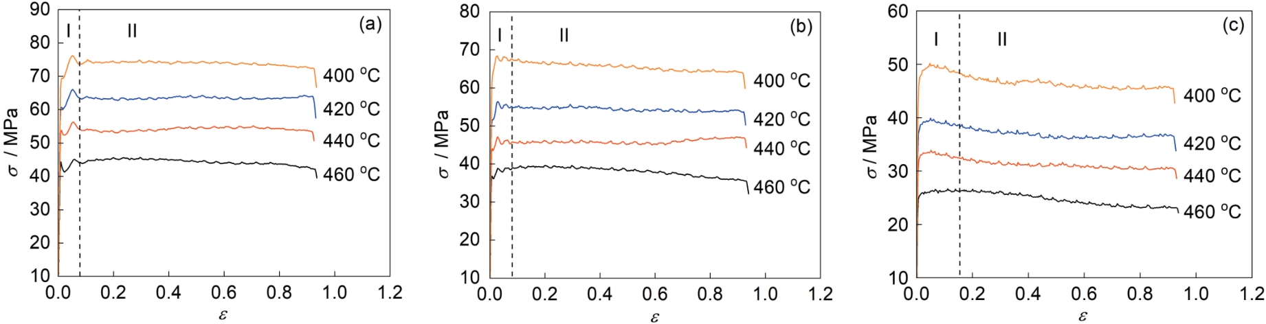 Fig.1 Stress-strain curves of Al-Zn-Mg alloy (a) 0.1 s-1; (b) 0.05 s-1; (c) 0.01 s-1 |