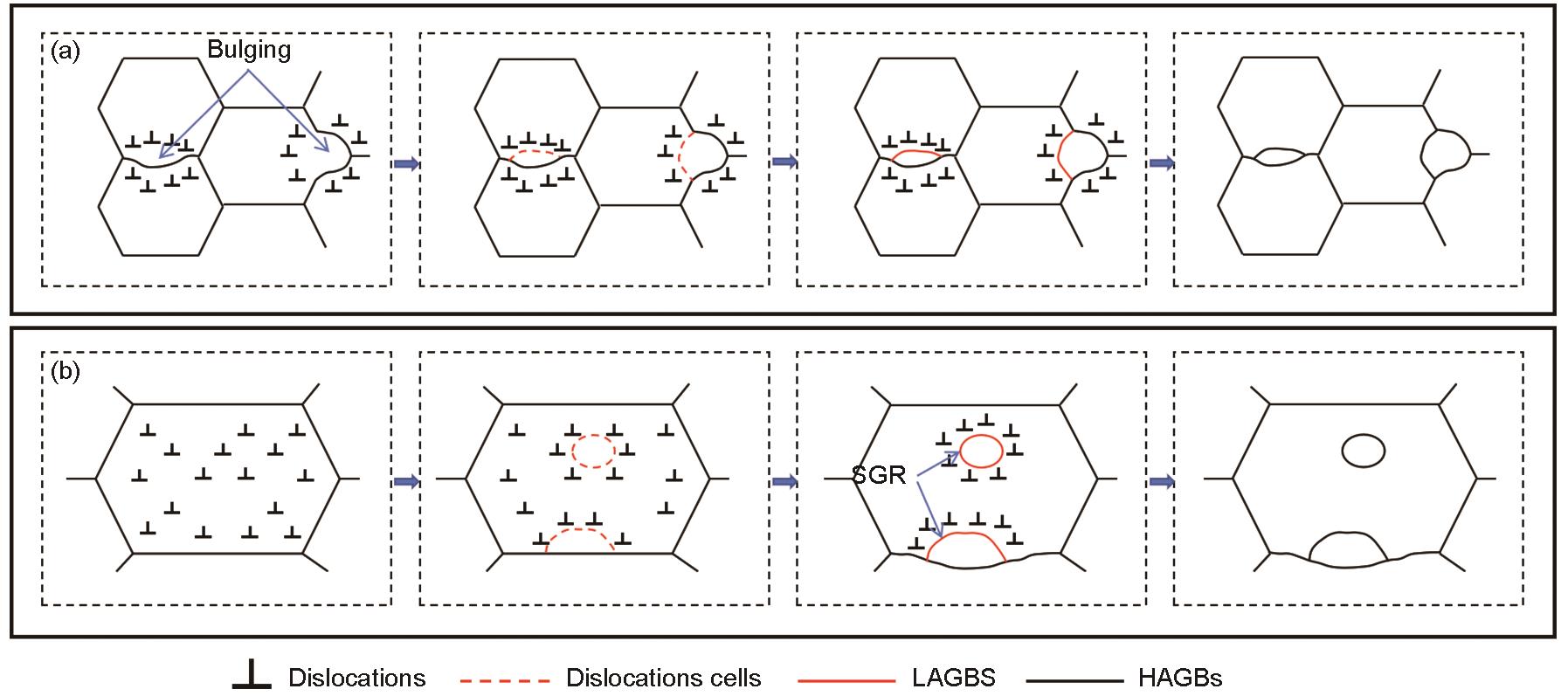 Fig.9 Schematic of two dynamic recrystallization evolutionary mechanisms (a) DDRX; (b) CDRX |