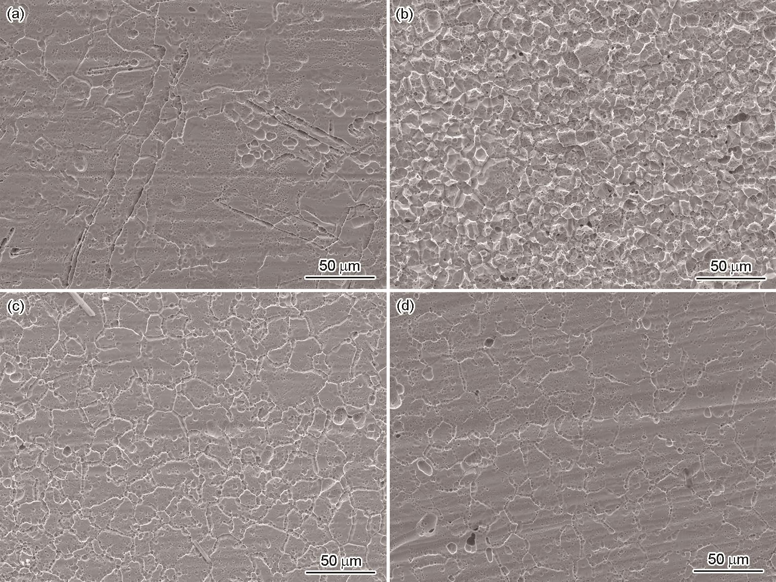 Fig.5 Corrosion morphology of Inconel 625 alloy in different states (a) as-rolled, (b) air-cooled at 850 oC, (c) water-cooled at 950 oC, (d) water-cooled at 1000 oC |