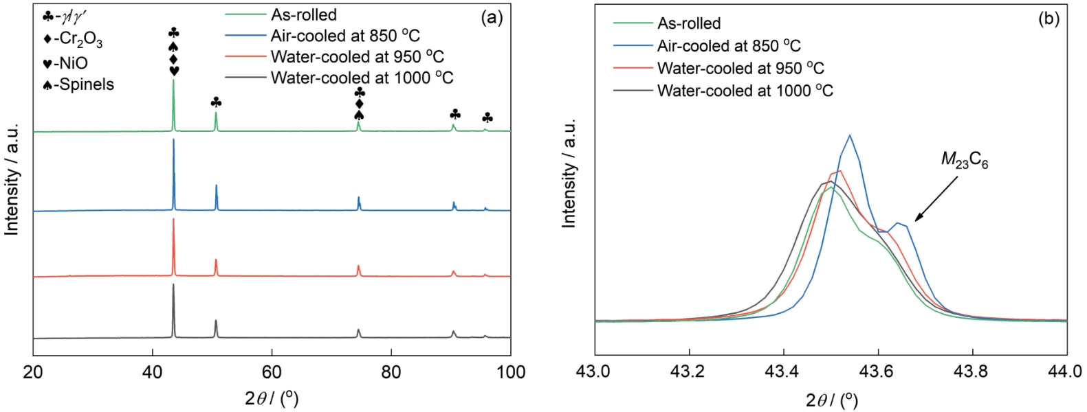 Fig.6 XRD patterns of corroded Inconel 625 alloy surfaces in different states (a) and zoomed-in view (b) |