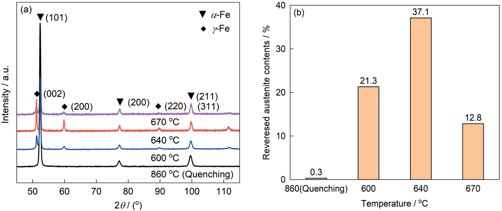 Fig.3 XRD patterns (a) and reversed austenite content (b) of 4Mn steel |