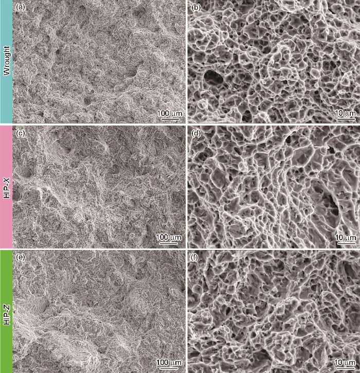Tensile fracture morphology of Ti-6Al-4V alloy (a, b) wrought Ti-6Al-4V alloy, (c, d) HIP-X Ti-6Al-4V alloy, (e, f) HIP-Z Ti-6Al-4V alloy