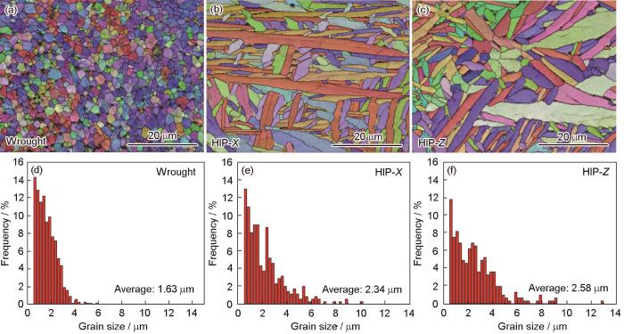 Grain structure (a-c) and size distribution (d-f) of Ti-6Al-4V under different processing conditions (a, d) wrought Ti-6Al-4V alloy, (b, e) HIP-X Ti-6Al-4V alloy, (c, f) HIP-Z Ti-6Al-4V alloy