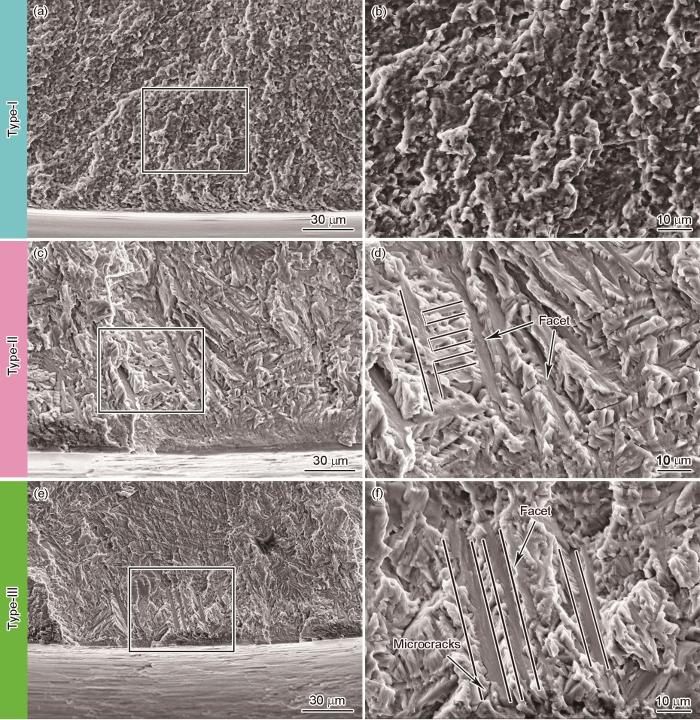 在本文的实验中观察到3种类型的疲劳裂纹萌生机制,分别命名为I型、II型和III型。I型为锻造态Ti-6Al-4V合金的疲劳裂纹萌生机制,裂纹萌生区域具有凹凸不平的“小峰”形貌(图10a和b),因为在塑性变形过程中微裂纹扩展并连接。SLM+HIP Ti-6Al-4V合金的疲劳裂纹萌生机制为II型和III型,两者都与微观结构中的刻面相关,与HIP导致的α板条粗化和变形有关[31](图10c~f)。其中II型刻面的分布较为复杂,由多个“T”形构成,而III型则由多条平行刻面构成,且附近出现了细小的次级裂纹(图10d和f)。刻面的形成机制遵循Bache[32]和Neal[33]提出的钛合金软/硬晶粒裂纹形核模型,涉及穿晶断裂和沿晶断裂两种模式。