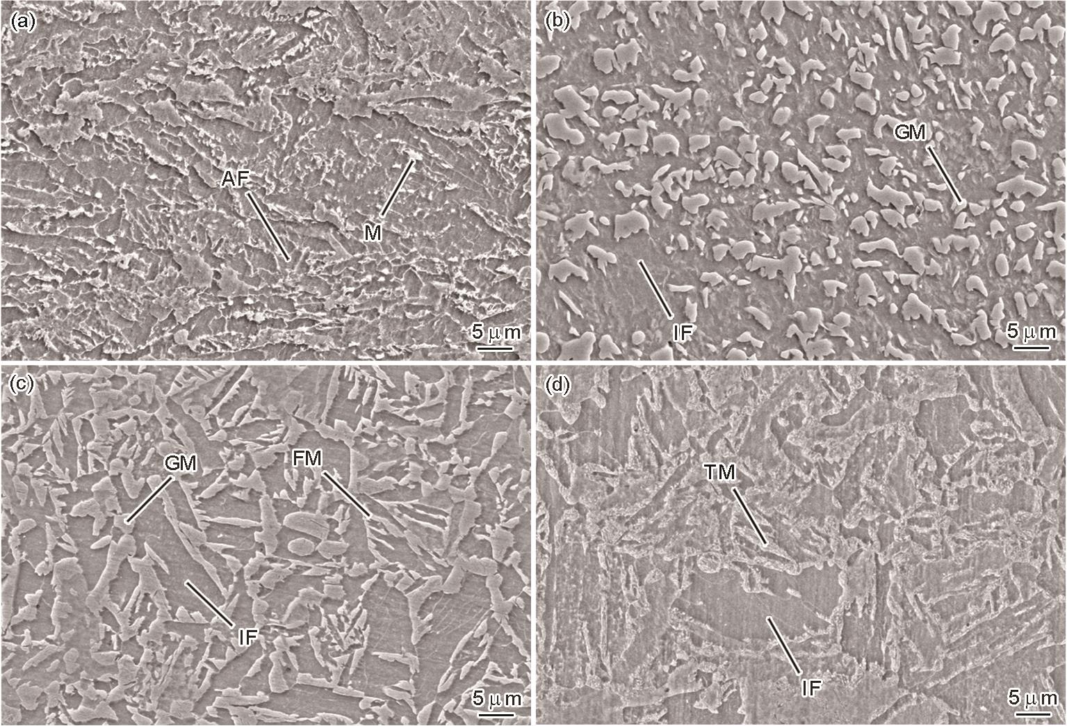 | Fig.3 SEM images showing the microstructures in 500 MPa grade wind power steels with different heat treatment technologies (a) OS, (b) IA, (c) QIA, (d) QIAT |
