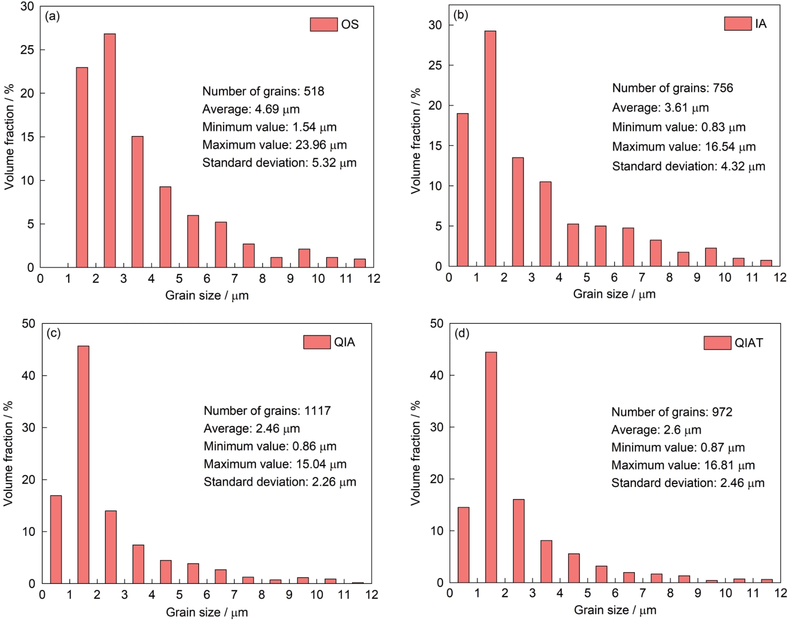 | Fig.10 Grain size distribution of 500 MPa grade wind power steels with different heat treatment technologies (a) OS, (b) IA, (c) QIA, (d) QIAT |