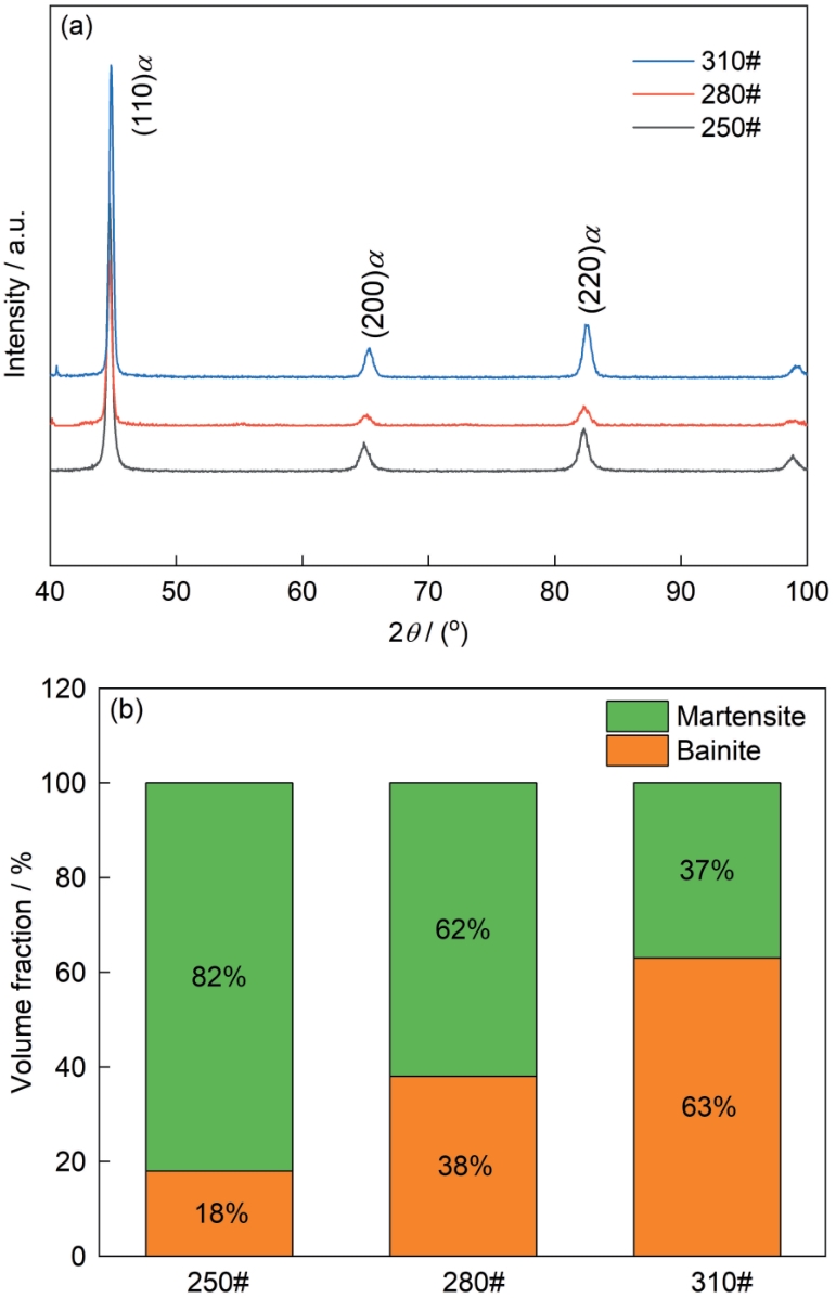 | Fig.5 XRD pattern (a) and phase volume fraction (b) of tested steel after isothermal quenching at different temperature |